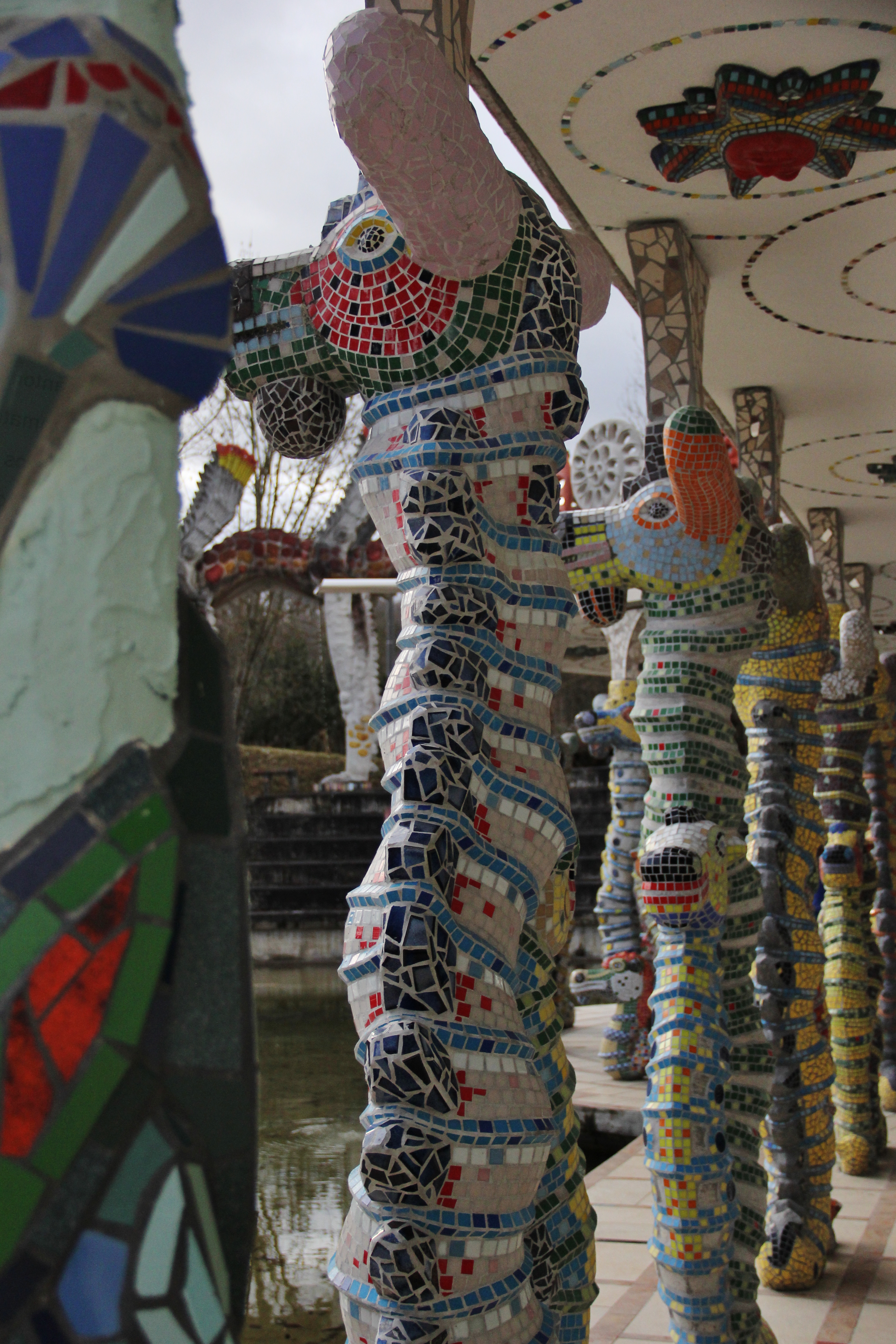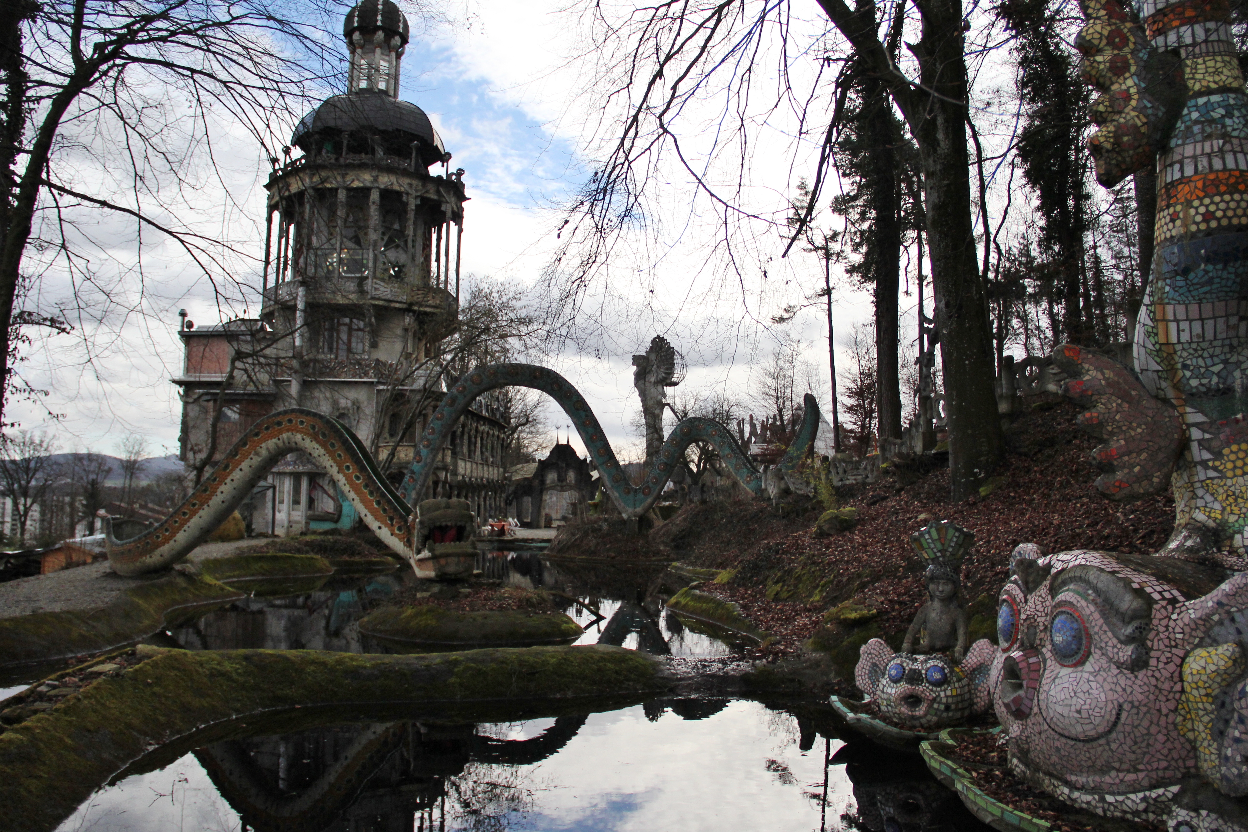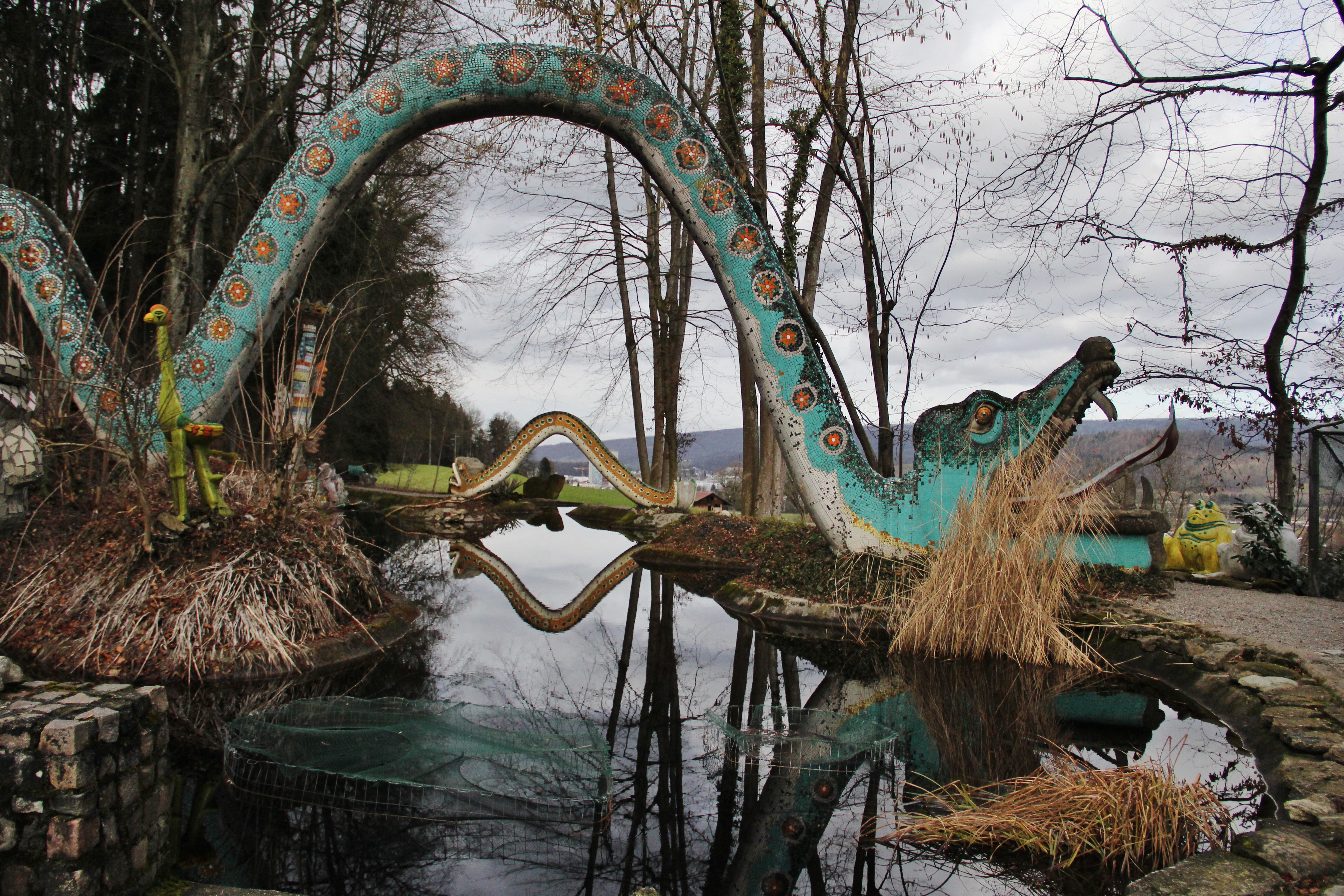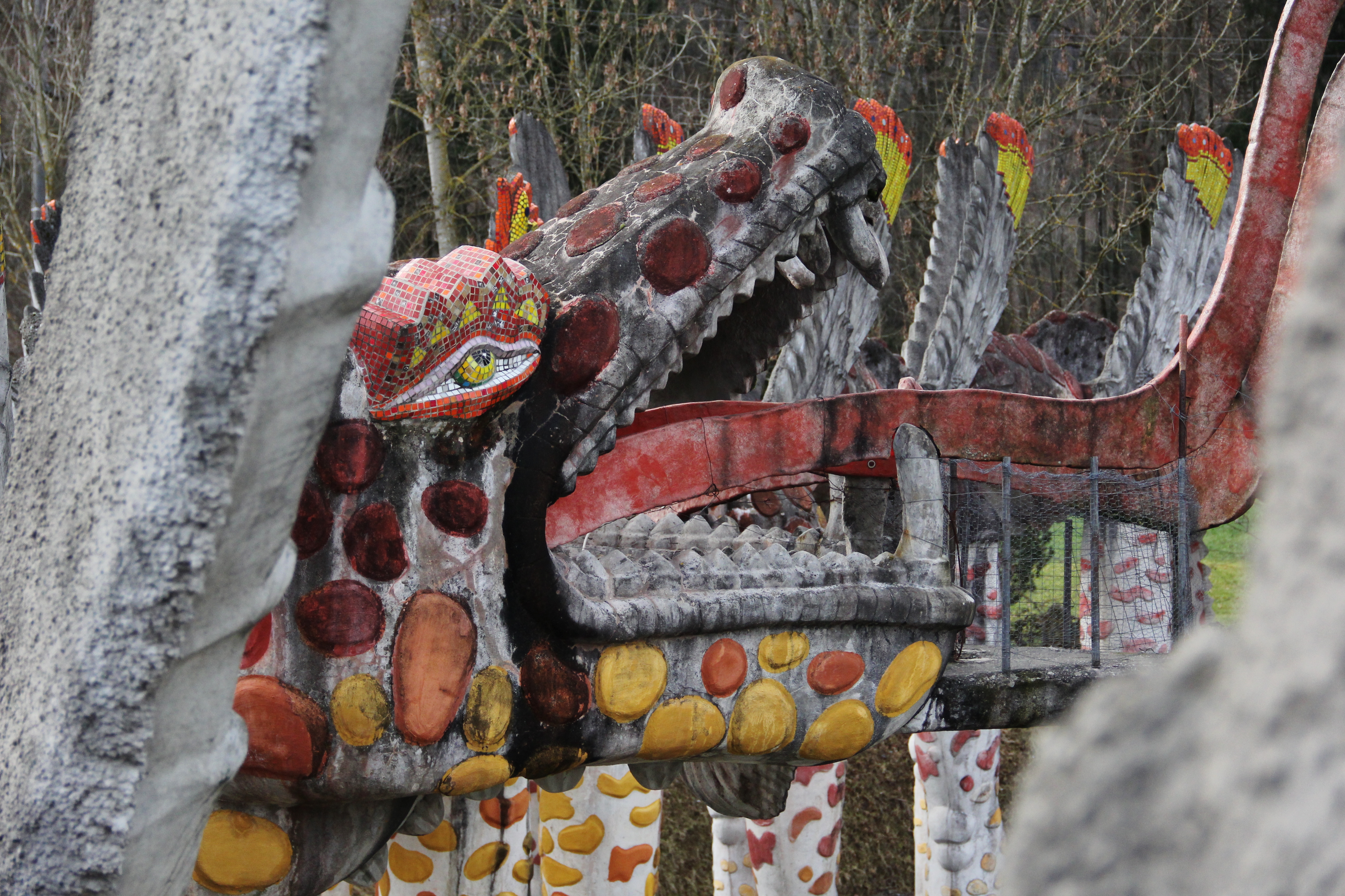 Man spaziert neben dem Waldrand in den Park hinein und taucht mit menschlichen- und tierartigen Kreaturen in eine bunte und skurrile Welt der Fabelwesen ein. Einhörner, nackte Stein-Frauen, lustige Grimassen, böse Gesichtsausdrücke, Katzen, Pferde, Löwen mit Flügel, Seepferdchen, Drachen, Hirsche und Fische habe ich entdeckt. Es ist ein Reich für die gesamte Familie. Die Kinder können Verstecken spielen, man kann sich gegenseitig in den Skulpturen fotografieren und schmale, hohe Durchgänge erkunden. Es gibt vieles zu entdecken und zu bestaunen. Wandmalereien mit dreidimensionalen Figuren und Mosaiksteinen verzieren die Häuser.
