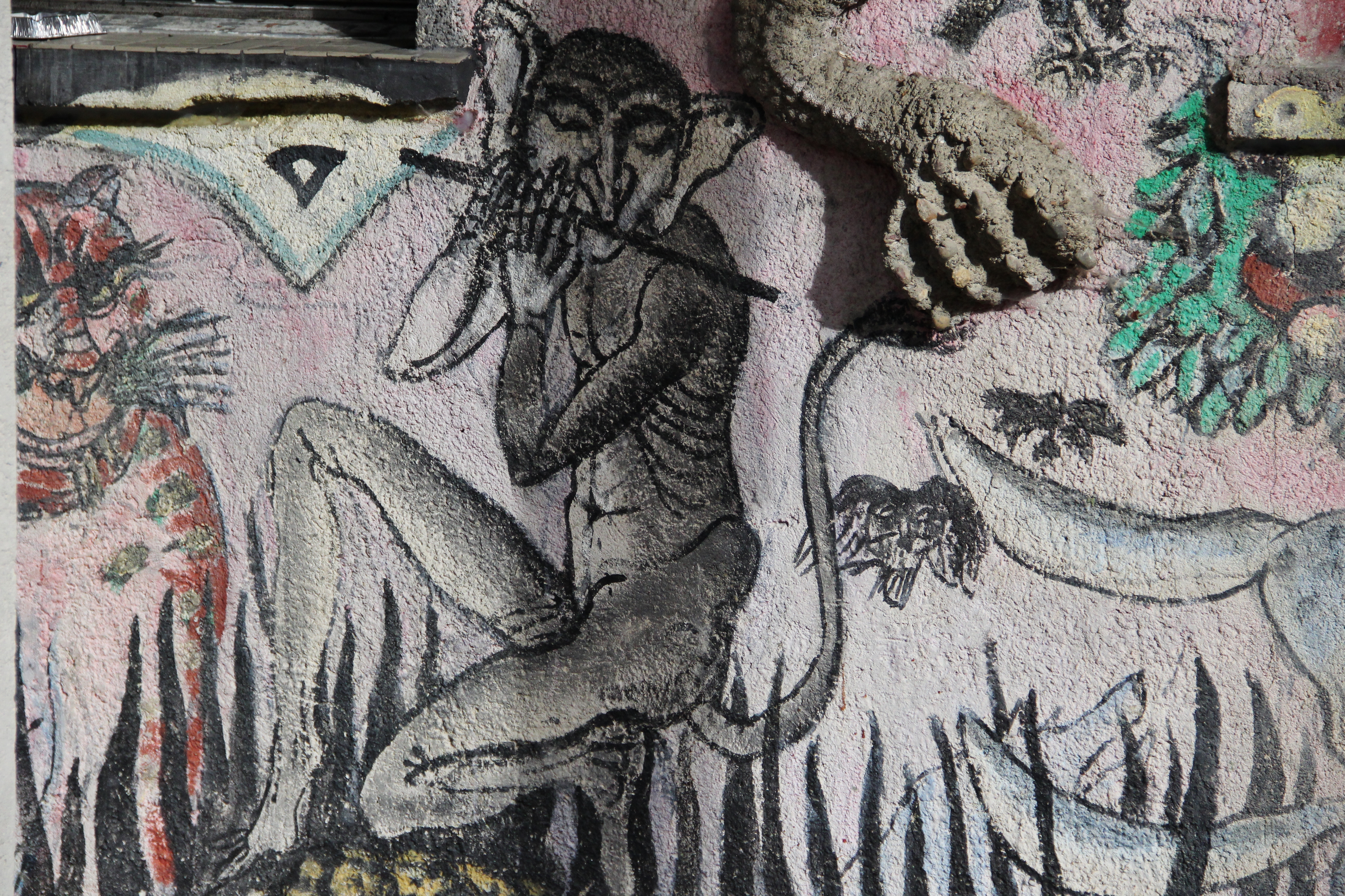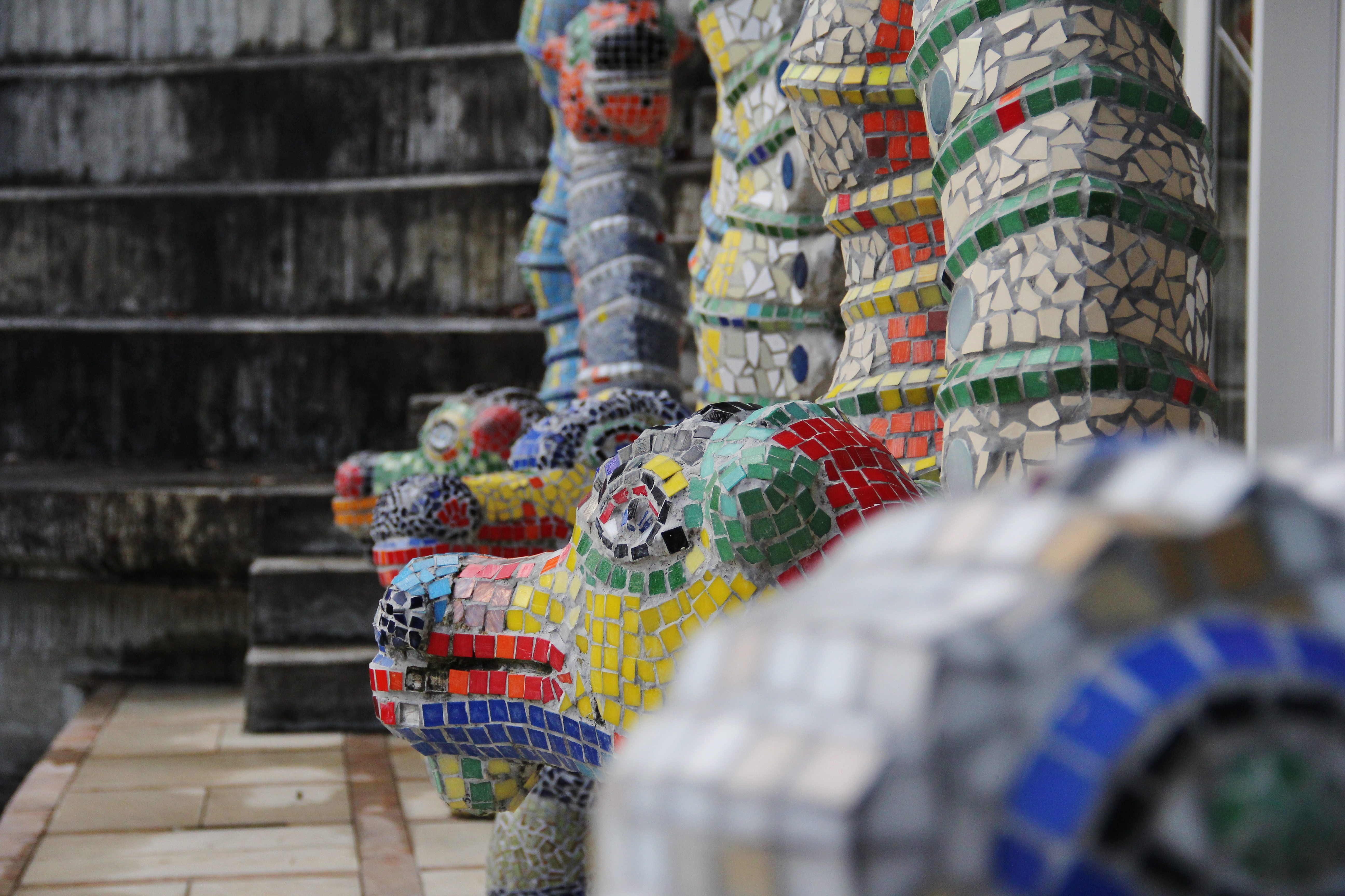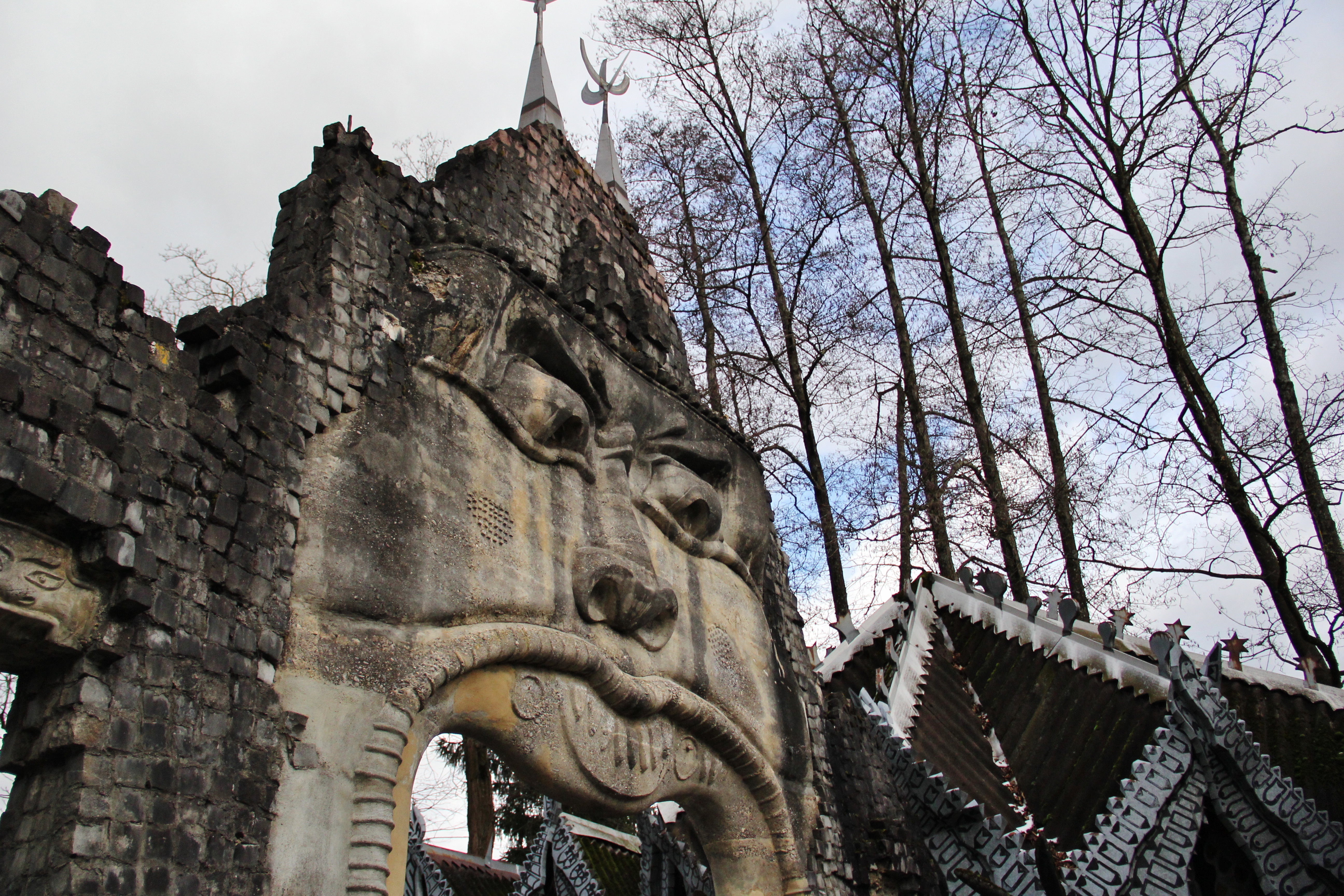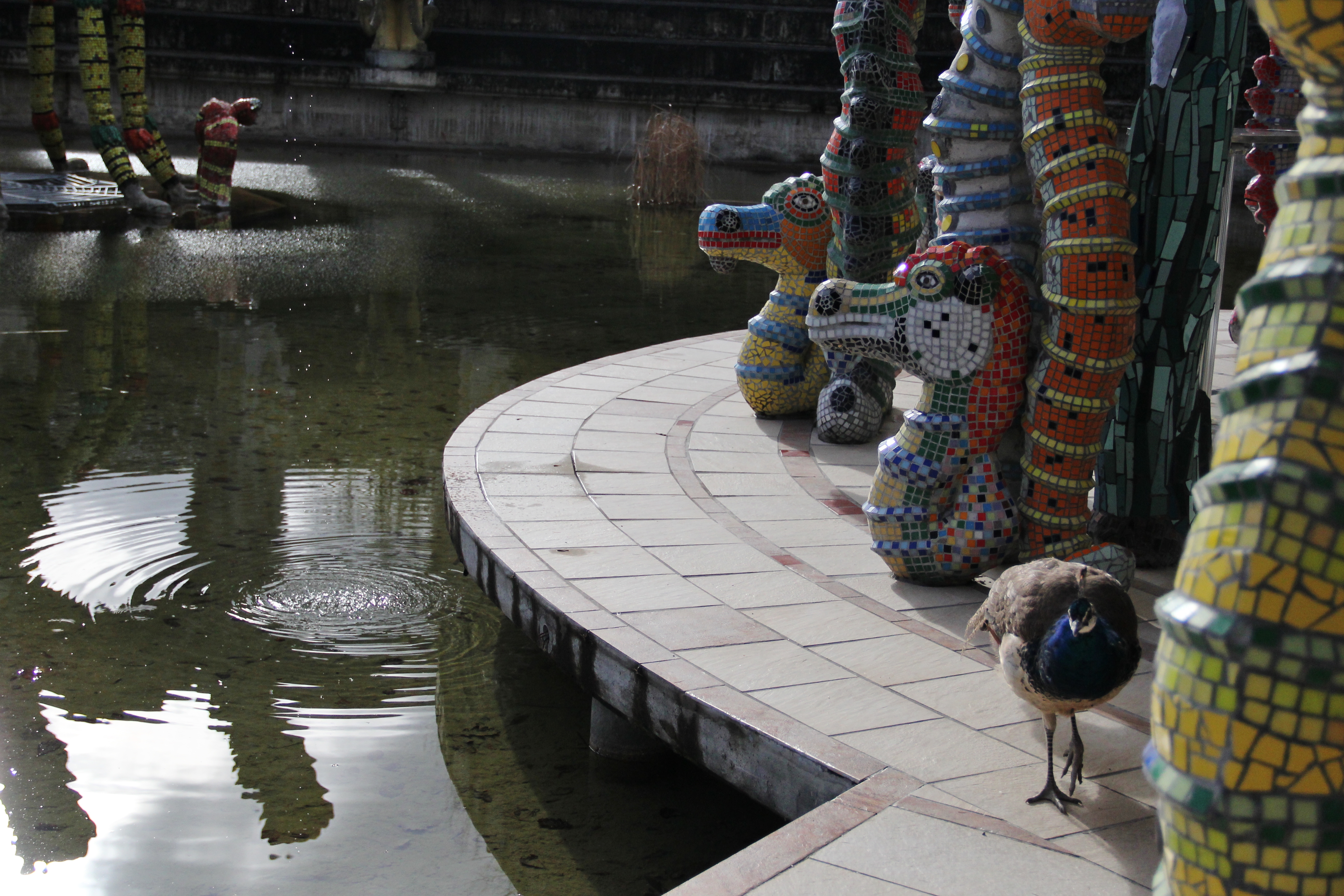 Man spaziert neben dem Waldrand in den Park hinein und taucht mit menschlichen- und tierartigen Kreaturen in eine bunte und skurrile Welt der Fabelwesen ein. Einhörner, nackte Stein-Frauen, lustige Grimassen, böse Gesichtsausdrücke, Katzen, Pferde, Löwen mit Flügel, Seepferdchen, Drachen, Hirsche und Fische habe ich entdeckt. Es ist ein Reich für die gesamte Familie. Die Kinder können Verstecken spielen, man kann sich gegenseitig in den Skulpturen fotografieren und schmale, hohe Durchgänge erkunden. Es gibt vieles zu entdecken und zu bestaunen. Wandmalereien mit dreidimensionalen Figuren und Mosaiksteinen verzieren die Häuser.