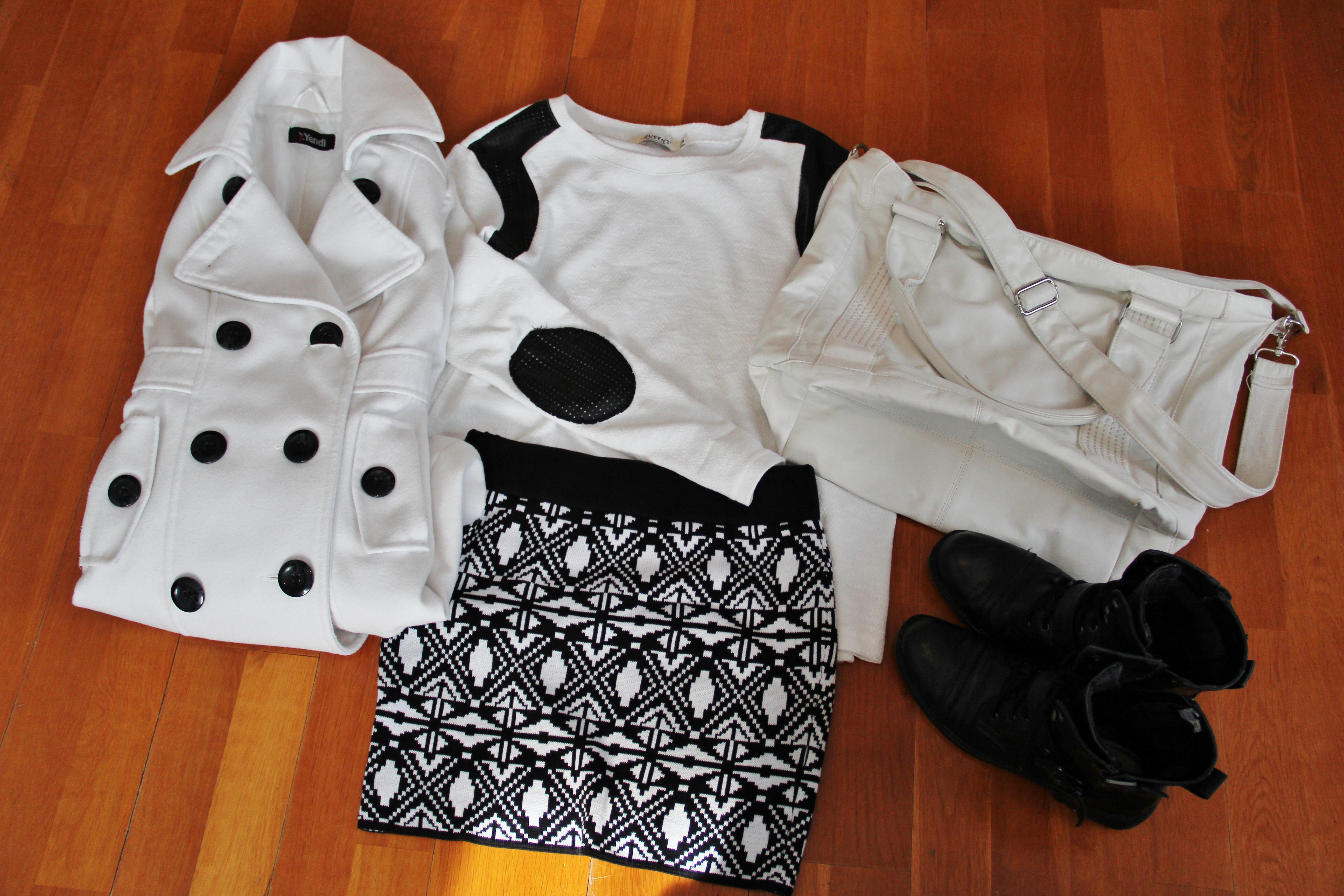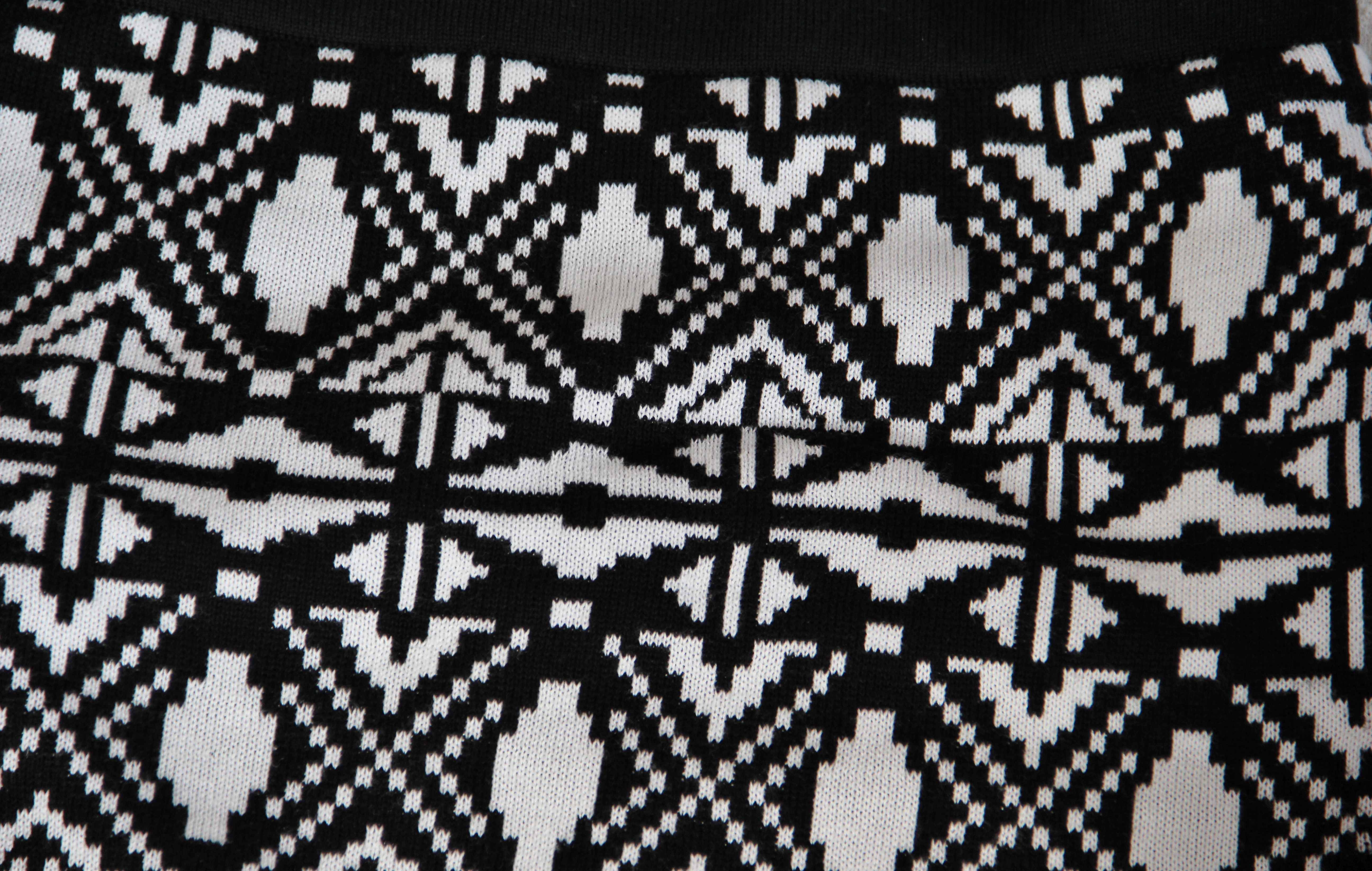 Schwarz-Weiss Jupe aus Wolle mit abstrakten Prints hält die Beine warm. Dazu kombinieren kann man Leggings oder schwarze, blickdichte Strümpfe. Ich empfehle keine gemusterten Strümpfe zu nehmen. Manchmal ist eben weniger mehr.