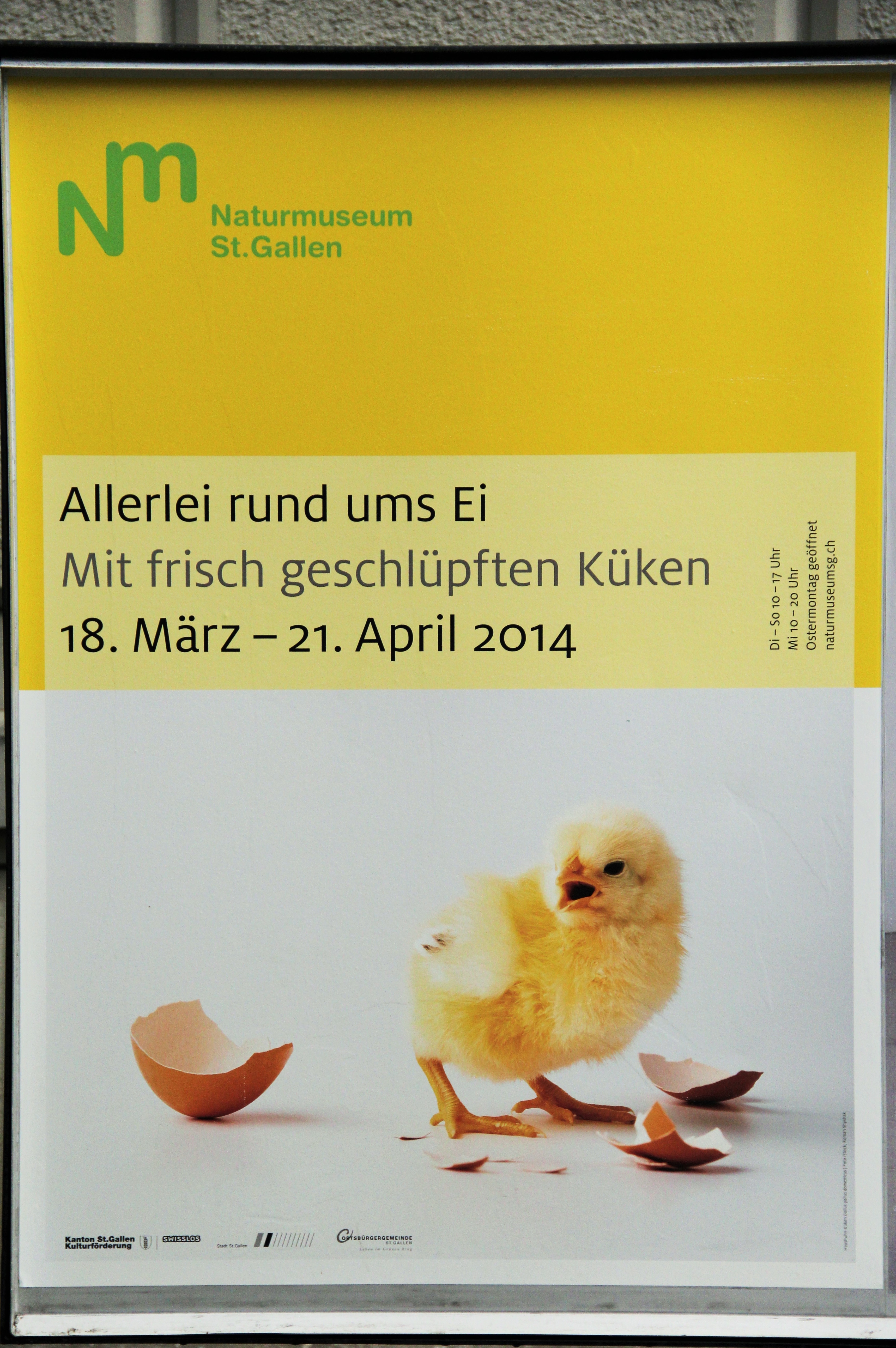 Das Naturmuseum St. Gallen widmete sich an Ostern dem Thema „Allerlei rund ums Ei“. Ich bin dem Werbeplakat hinterher und landete schliesslich in den Hallen des Naturmuseums, wo ich den Küken am schlüpfen zusehen konnte. Insgesamt 21 Tage braucht das Kleine bis es die Welt erblickt. Eine detaillierte Beschreibung mit Bildern findet bei den Fotos.