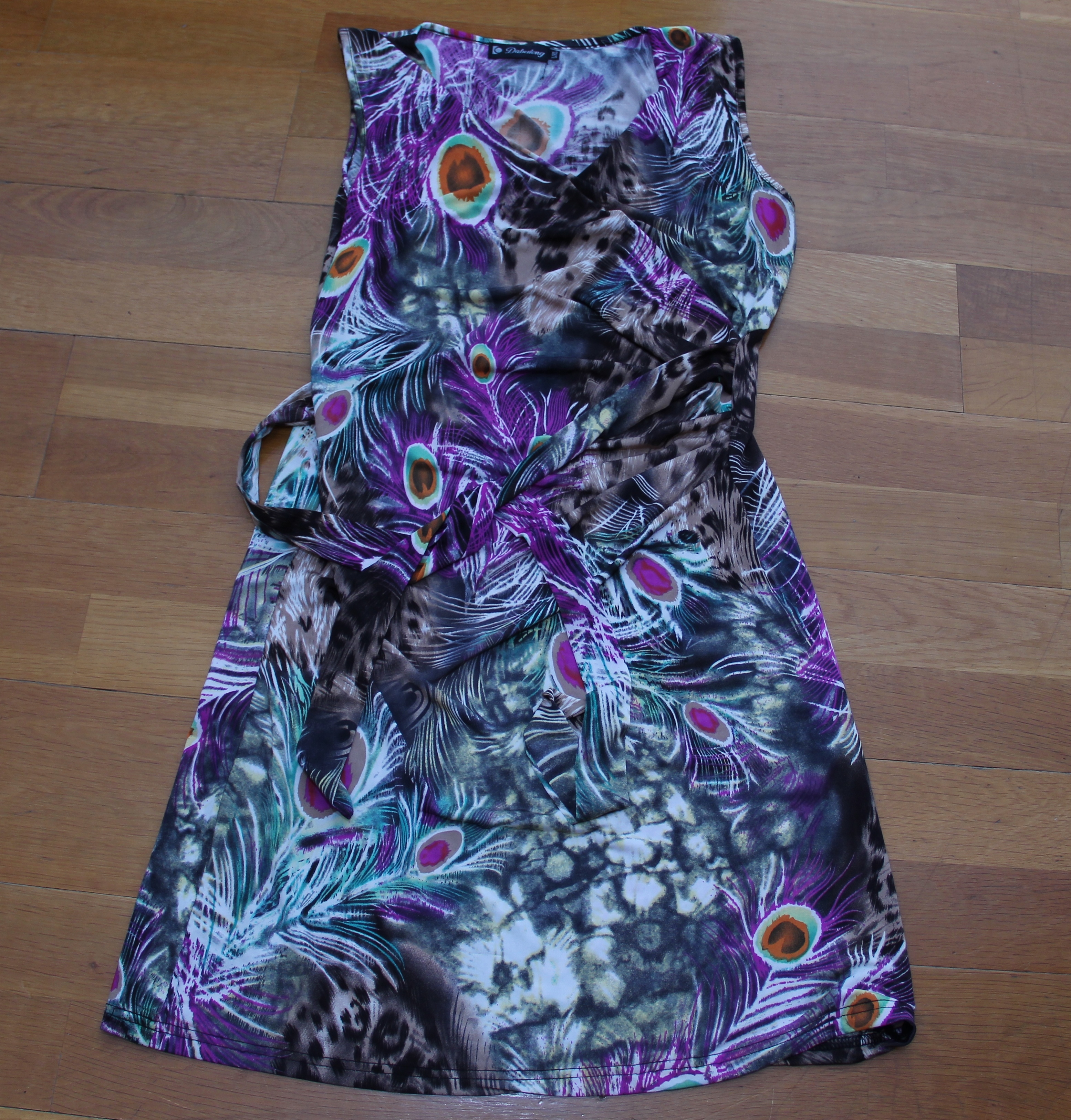 Das Kleid aus Polyamid ist wie Seide. Der Mustermix aus Leo und Pfauenfedern ist gewagt, wirkt jedoch durch die Form des Kleides und der Schleife, die man um den Bauch binden kann, feminin.