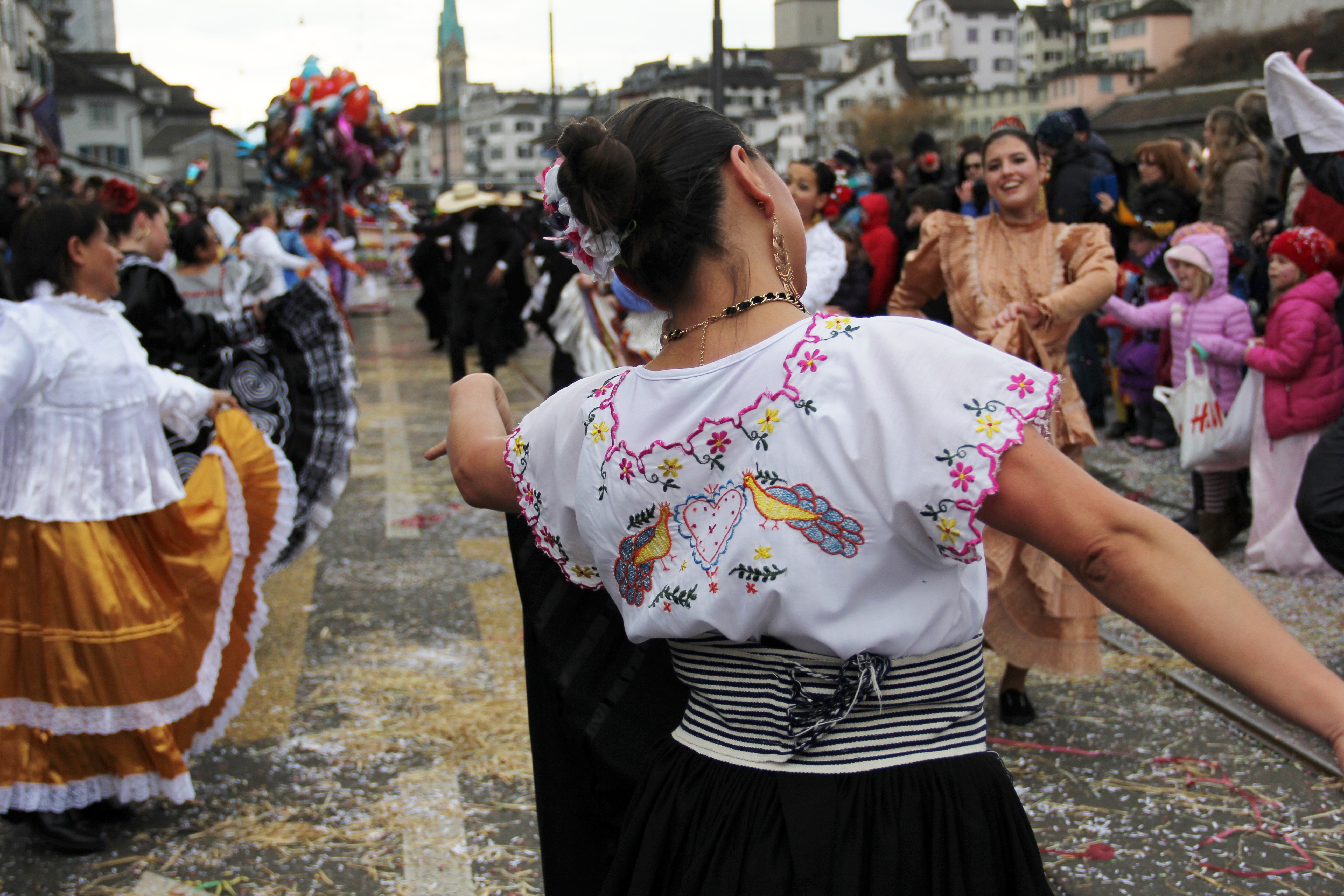 Trommeln und Trompeten, Kostüme und Masken, Brauchtum und Hexen. Die Fasnacht ist bunt und laut. Am Sonntag, 22. Februar 2015 zogen nationale und internationale Gruppen durch das Zürcher Zentrum. D`Guggemusik gibt volles Rohr und die Peruaner schwingen ihre Kleider und bringen mit spanischer Musik, südamerikanisches Feeling an die Zürcher Carneval Parade. Die Fasnacht soll gute Laune verbreiten. Die Zuschauer zücken ihre Handys und ich muss mich in die vorderste Reihe durchquetschen, damit ich meine Bilder bekomme. Die Zuschauer werden mit Clownnasen von der Roten Nase Truppe und Bonbons beschenkt. Die Gruppen stolzieren mit ihren farbigen und kreativen Kostümen durch die Strassen von Zürich. Scheint ein frohes Fest zu sein, mit lachenden und tanzenden Menschen.