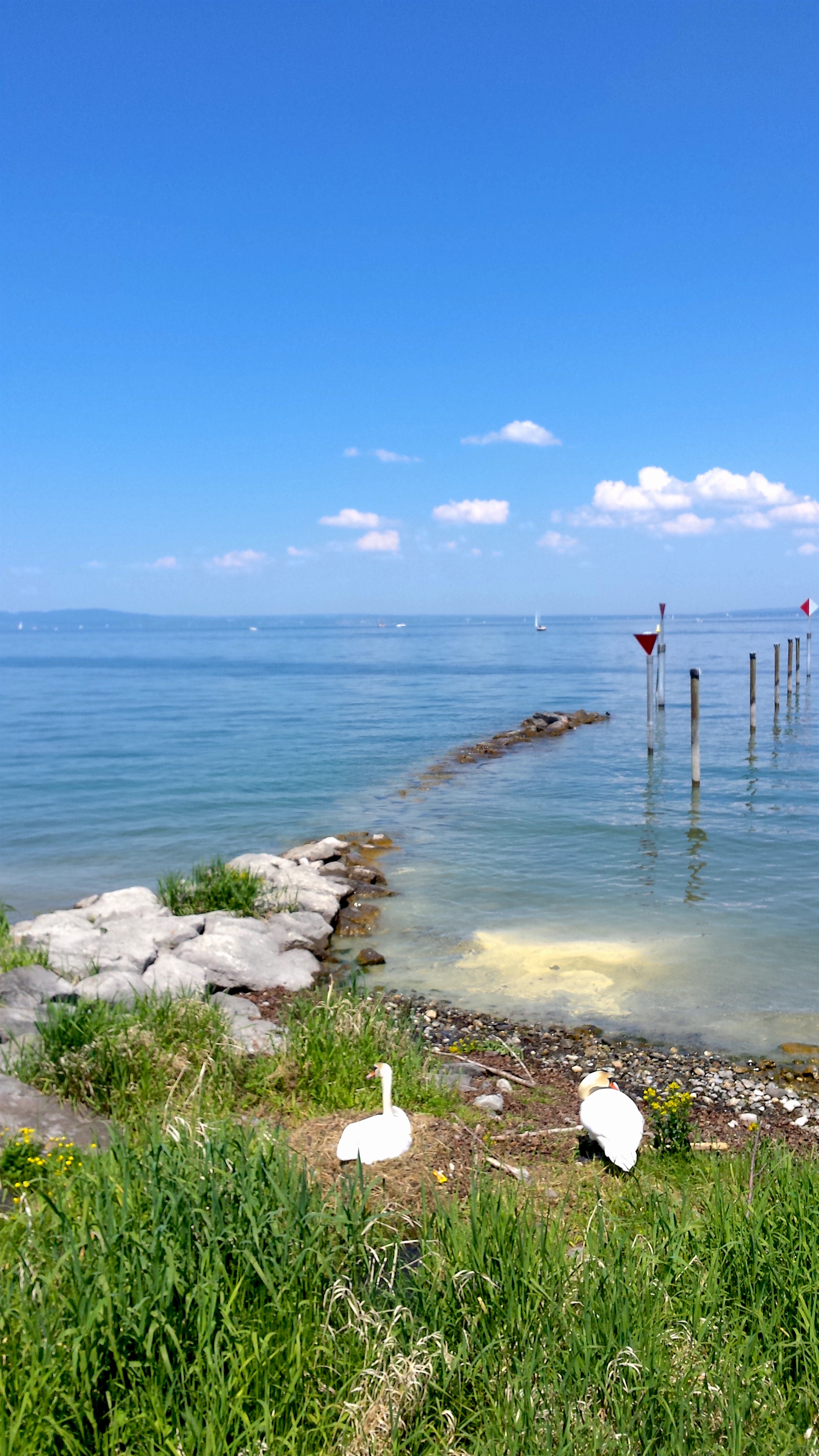 Ja, der Frühling in diesem Jahr hatte seine schönen Seiten: Verliebte Schwäne am Bodensee unter einem strahlend blauen Himmel. Doch einen Tag später war es vorbei – vorbei mit dem schönen Wetter. Die Schwäne liebten sich noch, aber es regnete ununterbrochen, als würde jemand Eimer voll Wasser vom Himmel schütten. Der Wasserpegel stieg und kam immer näher zum Schwanennest. Die Bewohner machten sich Sorgen. Ihr auch? Keine Bange, die Schwäne sind intelligente Tiere und wissen sich auch bei schweren Bedingungen zu helfen. Das Nest haben sie breiter und höher gebaut und wurde dadurch robuster. Auch wenn die Fluten das Nest vom Land weggetrieben hätten, wäre es standfest geblieben. Ende gut alles Gut. Die Schwanenfamilie schwimmt noch heute vergnügt auf dem Bodensee.