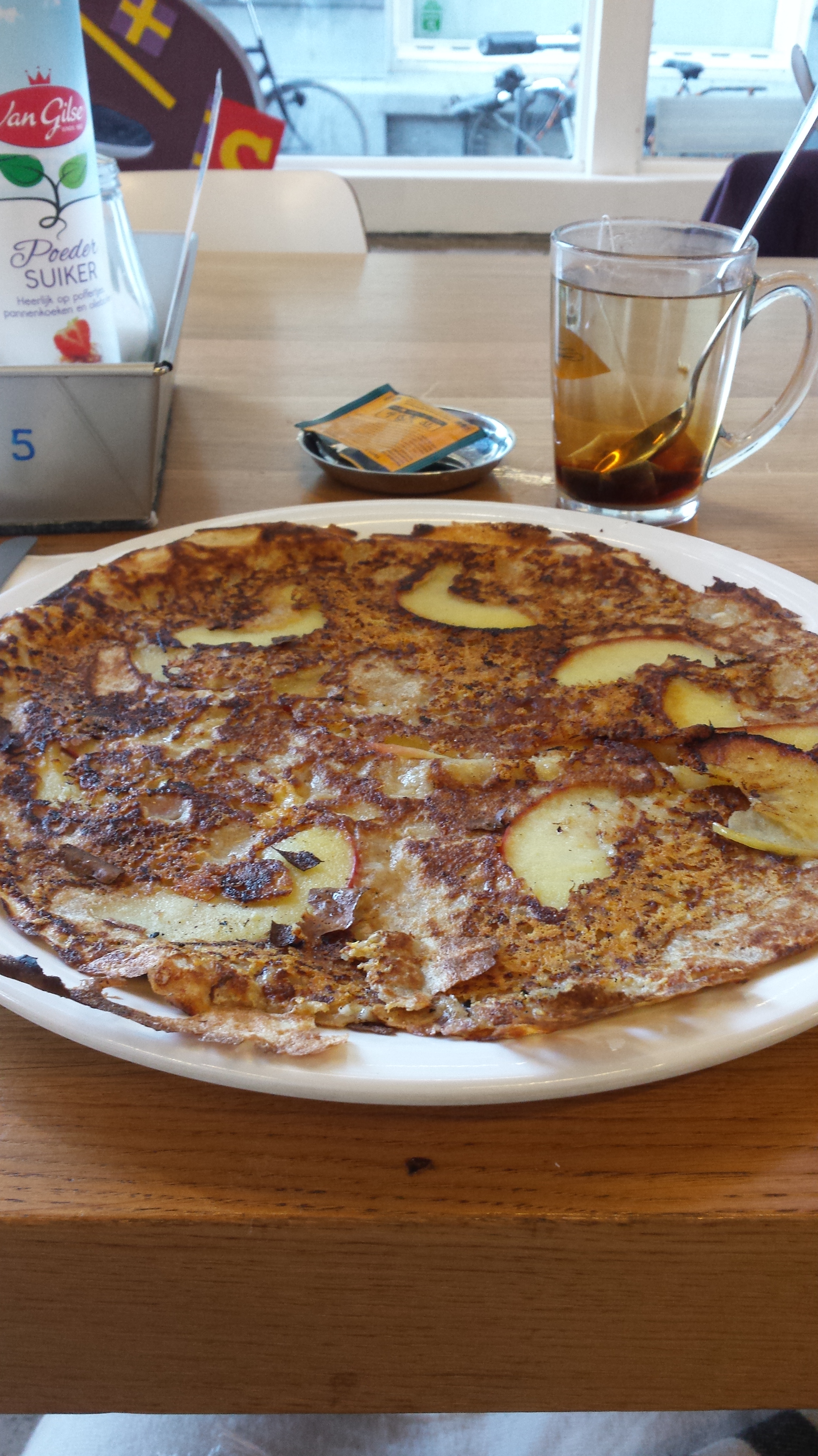 Pancakes, zu Deutsch bekannt als Pfannkuchen, oder in der Schweiz Crépe genannt. Das Restaurant Pancakes Amsterdam ist spezialisiert auf diese eierbasierende Süssigkeit. Wenn man das Restaurant betretet, riecht es nach Honig, Schokolade, Zimt und natürlich Eier. Auf der Menükarte sind jede Menge Varianten von Pancakes aufgelistet. Auf holländische Art isst man Pancakes mit Mushrooms oder Apples with Cheese. Beim ersten Gedanken rümpft man die Nase, aber die Kombination schmeckt tatsächlich. Die Räumlichkeit ist gediegen und einfach eingerichtet. Die grosse Fensterfront erhellt den Raum und ab und zu werfen Passanten neugierige Blicke hinein. Das Personal ist gutgelaunt und allzeit hilfsbereit.