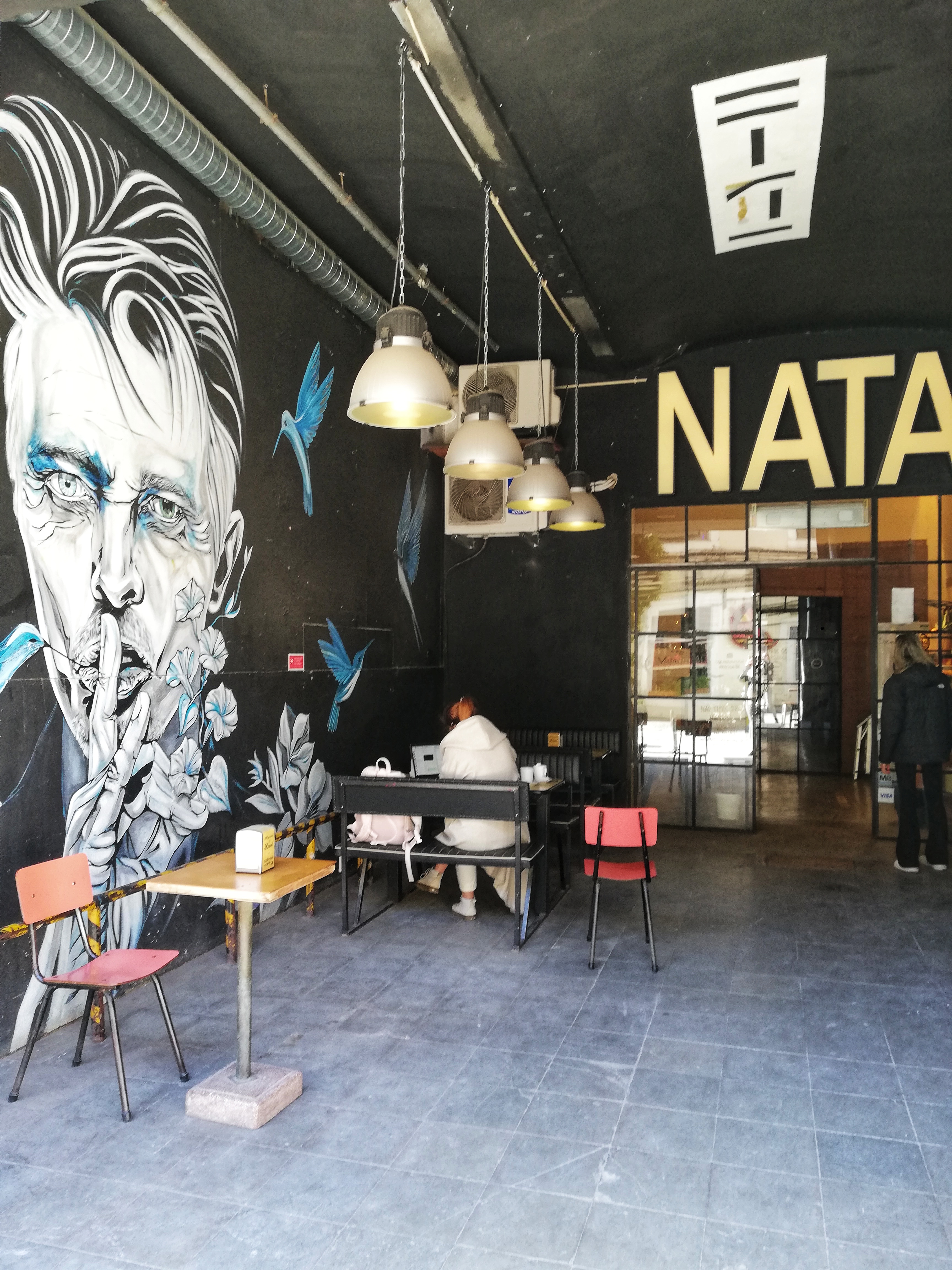 Mein Blick wandert an die mit Street-Art bedeckte Wand, während ich von der lauwarmen Schokolade nippe und vorsichtig in ein Pastel de Nata beisse. Die Künstlerin Jacqueline de Montaigne hat ein Meisterwerk an die Wand des Innenraums des Cafés erschaffen. Blaue Kolibris kreisen um den Kopf von Rocklegende David Bowie. Der schwarze Hintergrund bringt die Farben kräftig zum Vorschein. Das Café selbst ist sonst unscheinbar, hat einen versteckte inneren Tresen mit sorgfältig ausgewählten Süsswaren, draussen stehen einfache Holzstühle und Bänke, die den industriellen Charme mit modernem Touch der Gegend aufgreifen. Backsteinhäuser, die sich aneinanderreihen, Musik, die aus coolen Surfer- und Einrichtungsshops dröhnen und die Bibliothek Ler Devagar (langsam lesen), die mehr als eine Galerie erscheint mit ihren tausend sortierten Büchern auf mehreren Etagen und einzigartigen Kunstgegenständen.