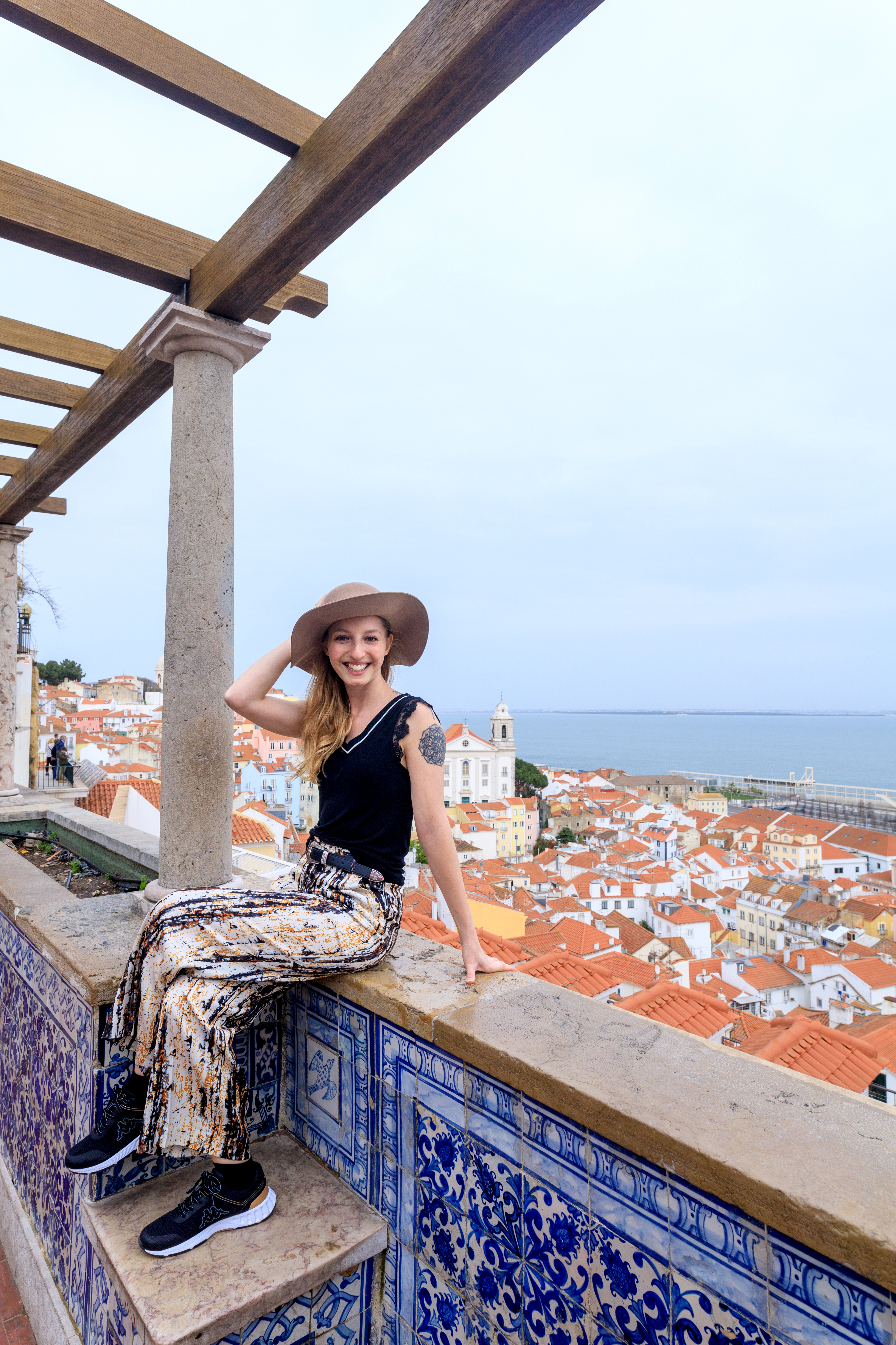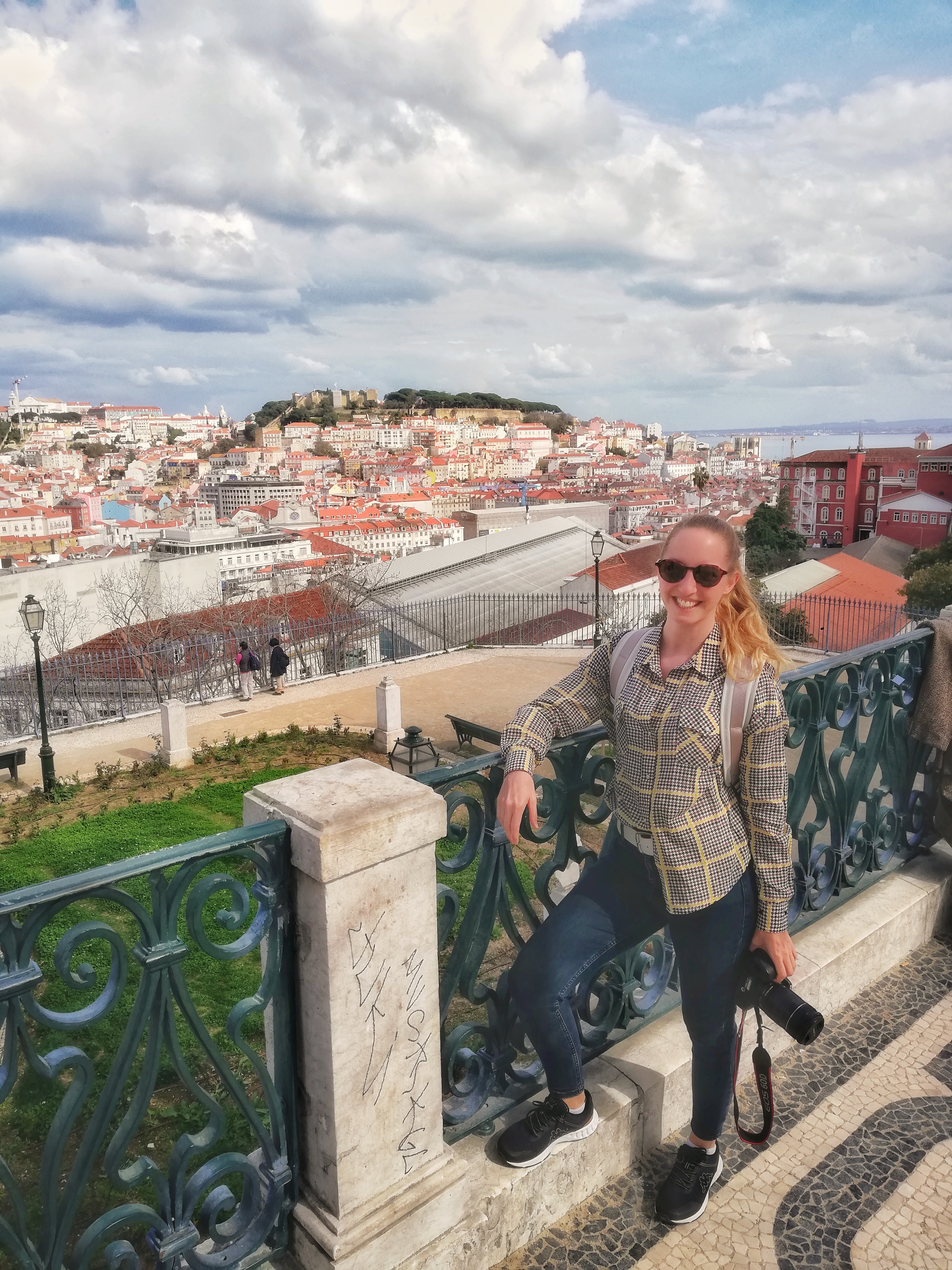 An einer steilen Seitenstrasse begegnet mir wieder die Tram 28. Hinter ihr sehe ich auf einem erhöhten Trottoir ein Café. Ich bestelle mir einen Mango-Smoothie. Die Toastbrote auf den Nachbartischen sehen auch zum Reinbeissen aus. Nach einer kurzen Verschnaufpause geht es auf schmalen Strassen weiter nach oben an der gotischen Catedral Sé Patriarcal vorbei. Ich springe über die Strasse, an der Tram 28 vorbei und komme zum Aussichtspunkt Miradouro Santa Luzia mit seinen blau-weissen aus Azulejo verzierten Wände. Touristen tummeln sich schon vor dem Mittag hier, um viele Fotos zu schiessen und den traumhaften Weitblick über Lissabon zu geniessen. Ich beobachte kurz das professionelle Fashion-Shooting, das sich daneben abspielt und mache es anschliessend genau gleich wie die Touristen: Mein Blick wandert vom Aussichtspunkt im Zeitlupentempo von links nach rechts und wieder zurück. Meine Mundwinkel ziehen sich nach oben und leichtes Kribbeln erfreut meine Arme. Ein Windstoss wirft eine Schalschlaufe hinter meine linke Schulter.