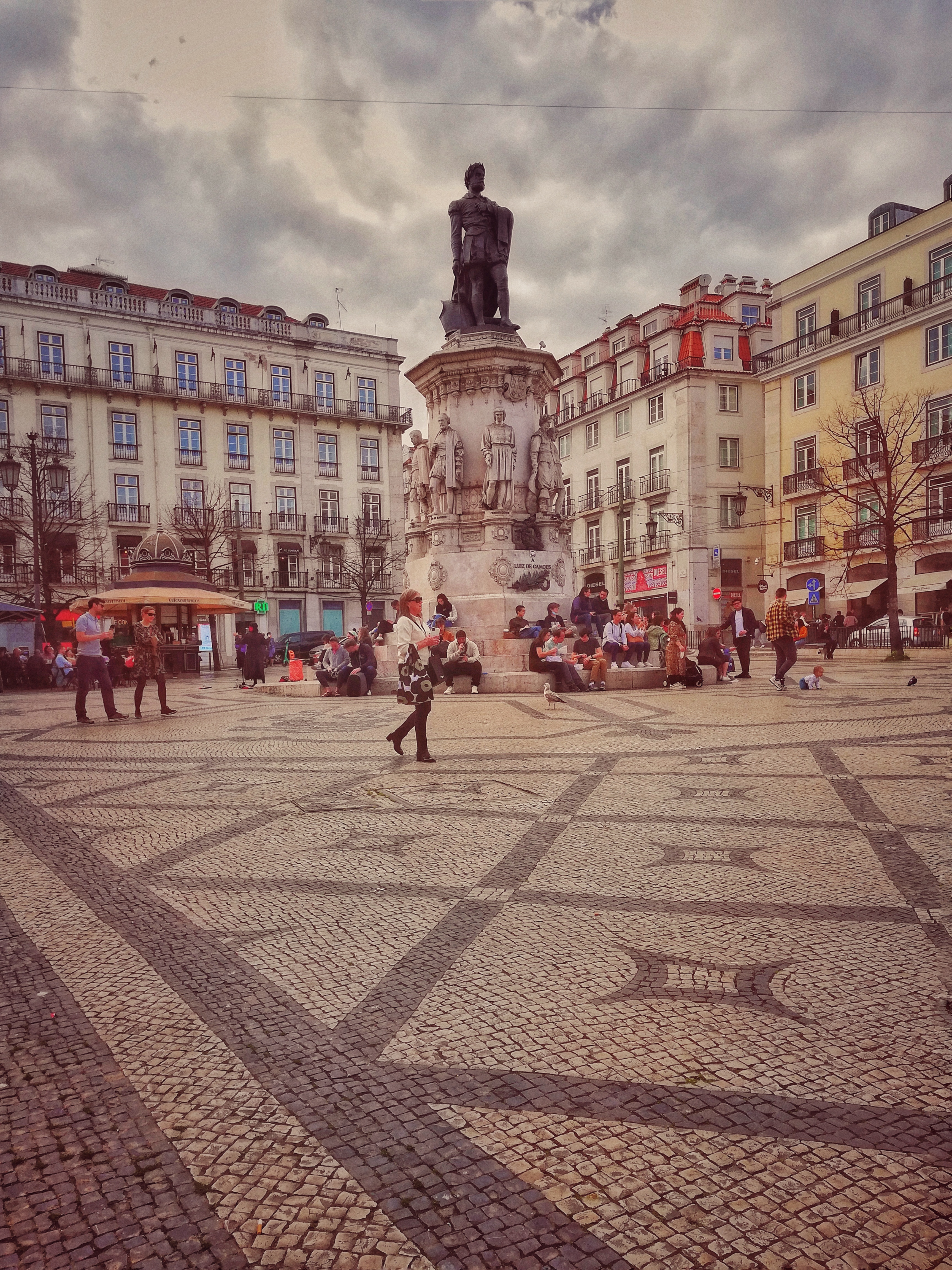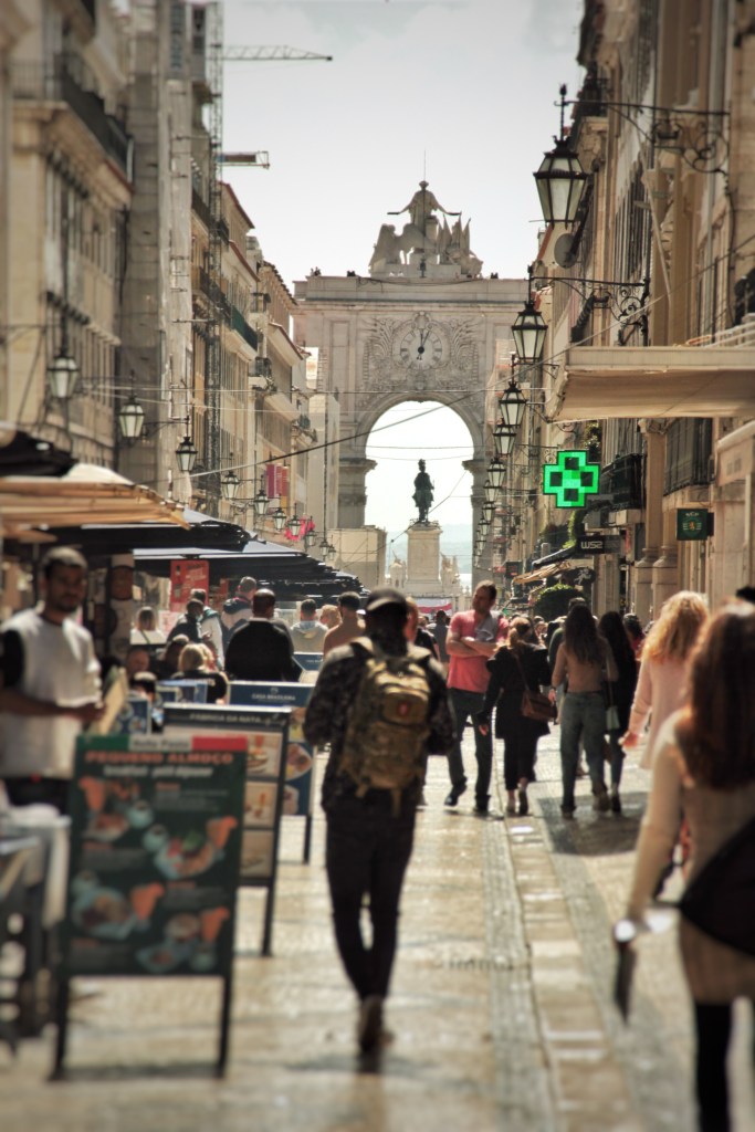 Der Wind wirbelt meine Haare leicht durcheinander. Die berühmte Tram 28 fährt neben der Praça Luis de Camões zügig an mir vorbei, mein Blick wandert ihr nach und ich versuche schnellstmöglich mit der Kamera ein Bild einzufangen, aber ein Auto fährt mir ins Bild. Es gibt noch andere Möglichkeiten, denke ich mir und bemerke plötzlich ein entstehendes weiches Licht, welches die Sonne hinter den Wolken auf die Altstadt wirft. Ich schlendere in bequemen Turnschuhen vorsichtig abwärts, um mich an die leicht rutschigen, doch kunstvollen Mosaikpflaster zu gewöhnen, zur Rua Augusta.