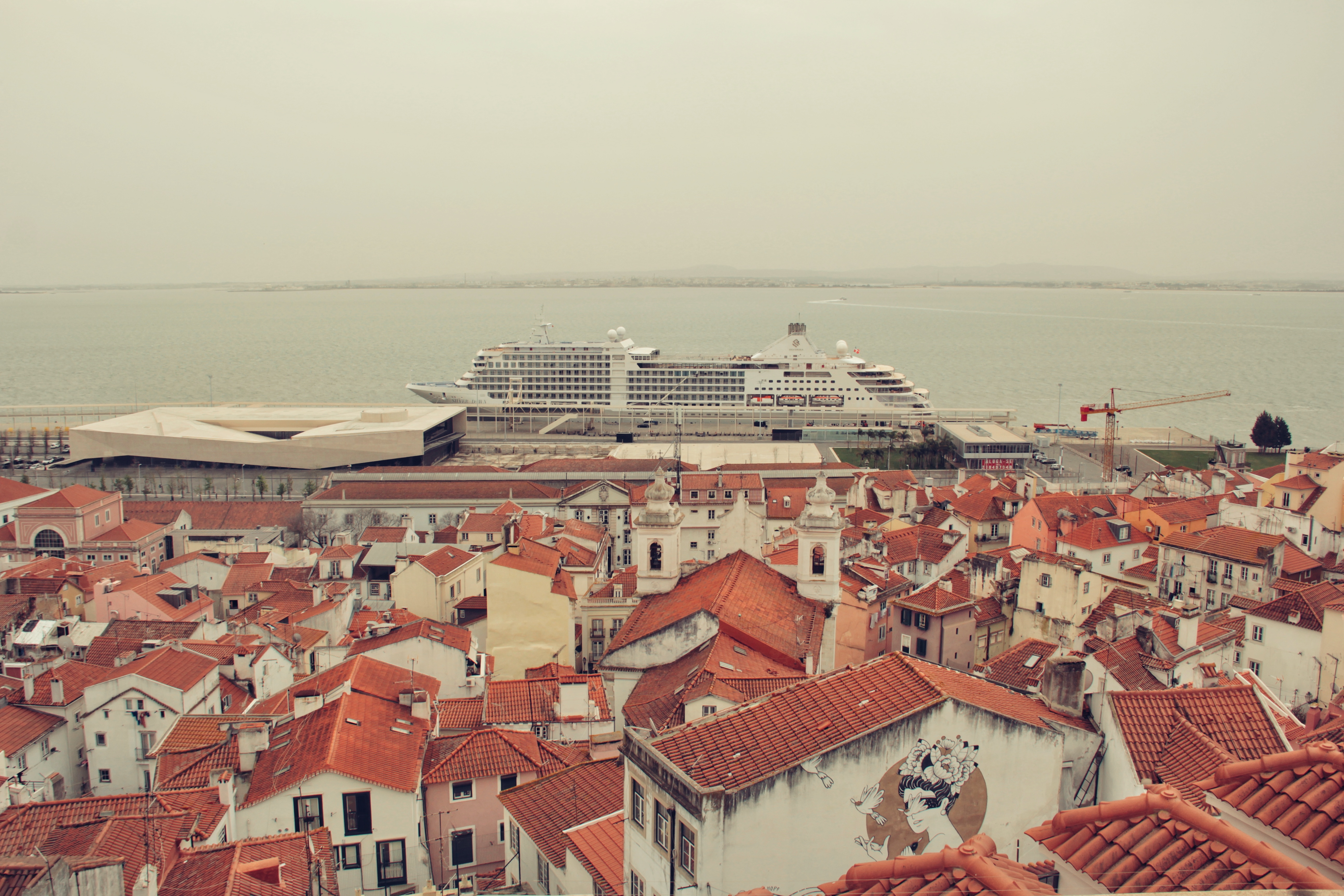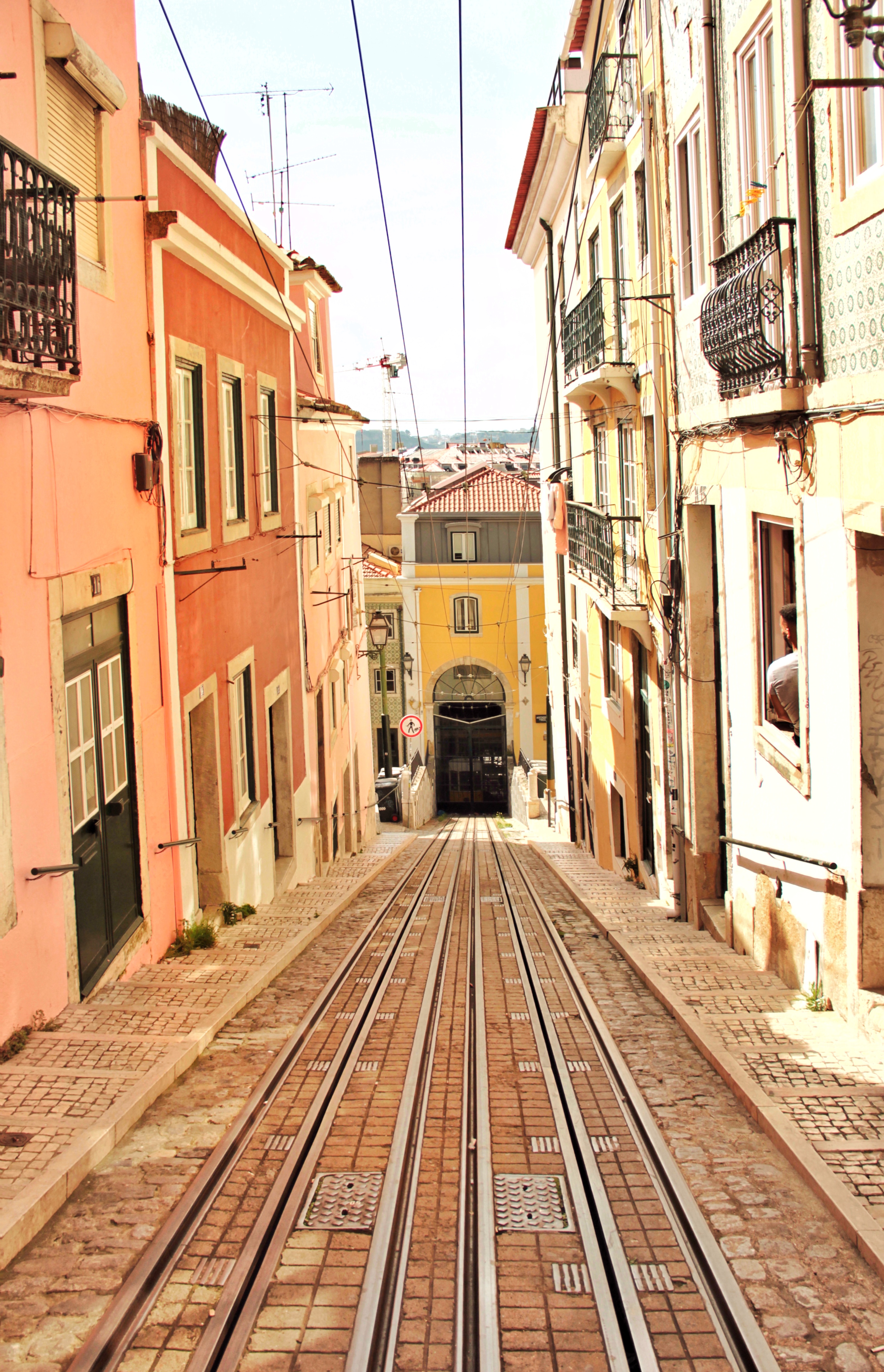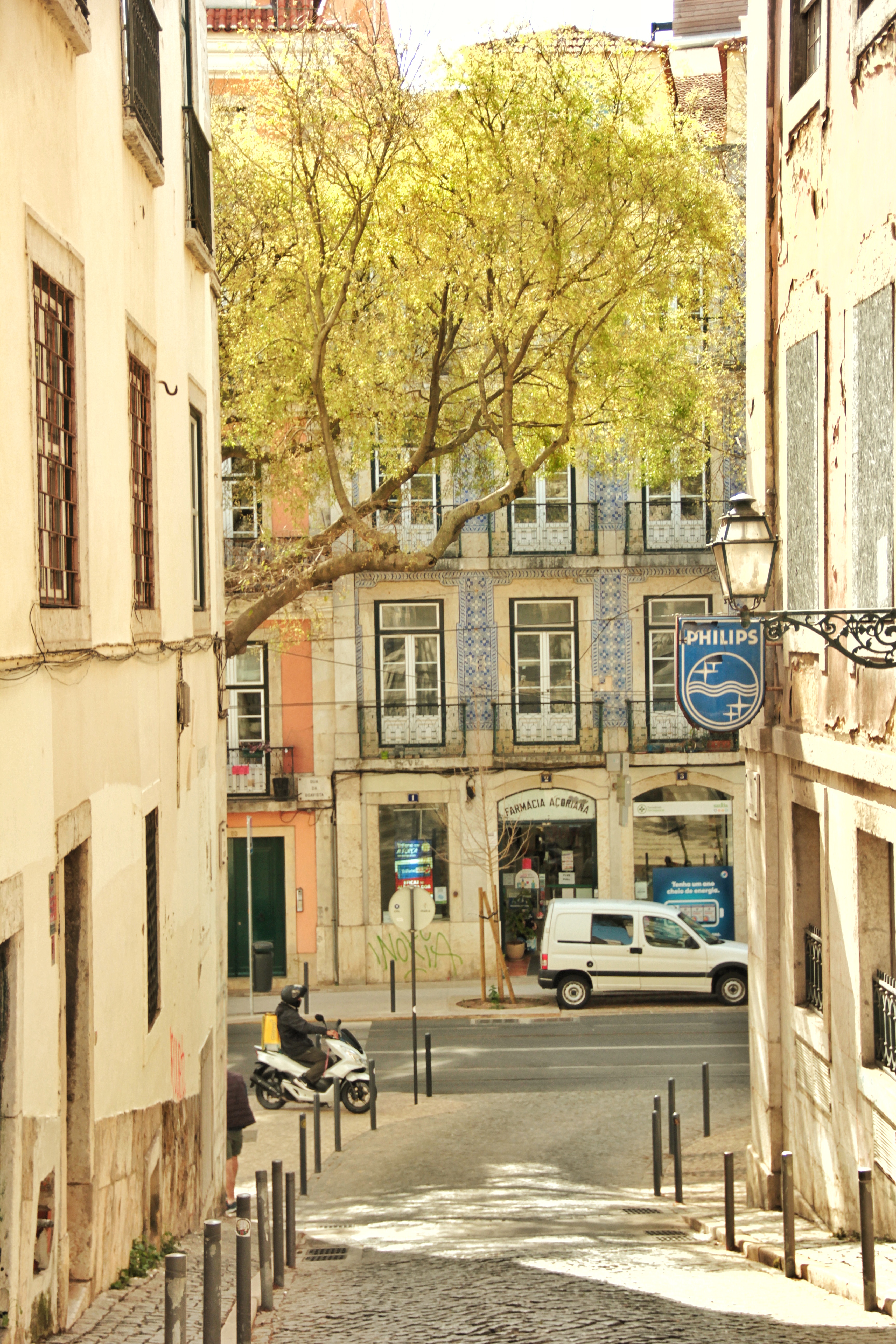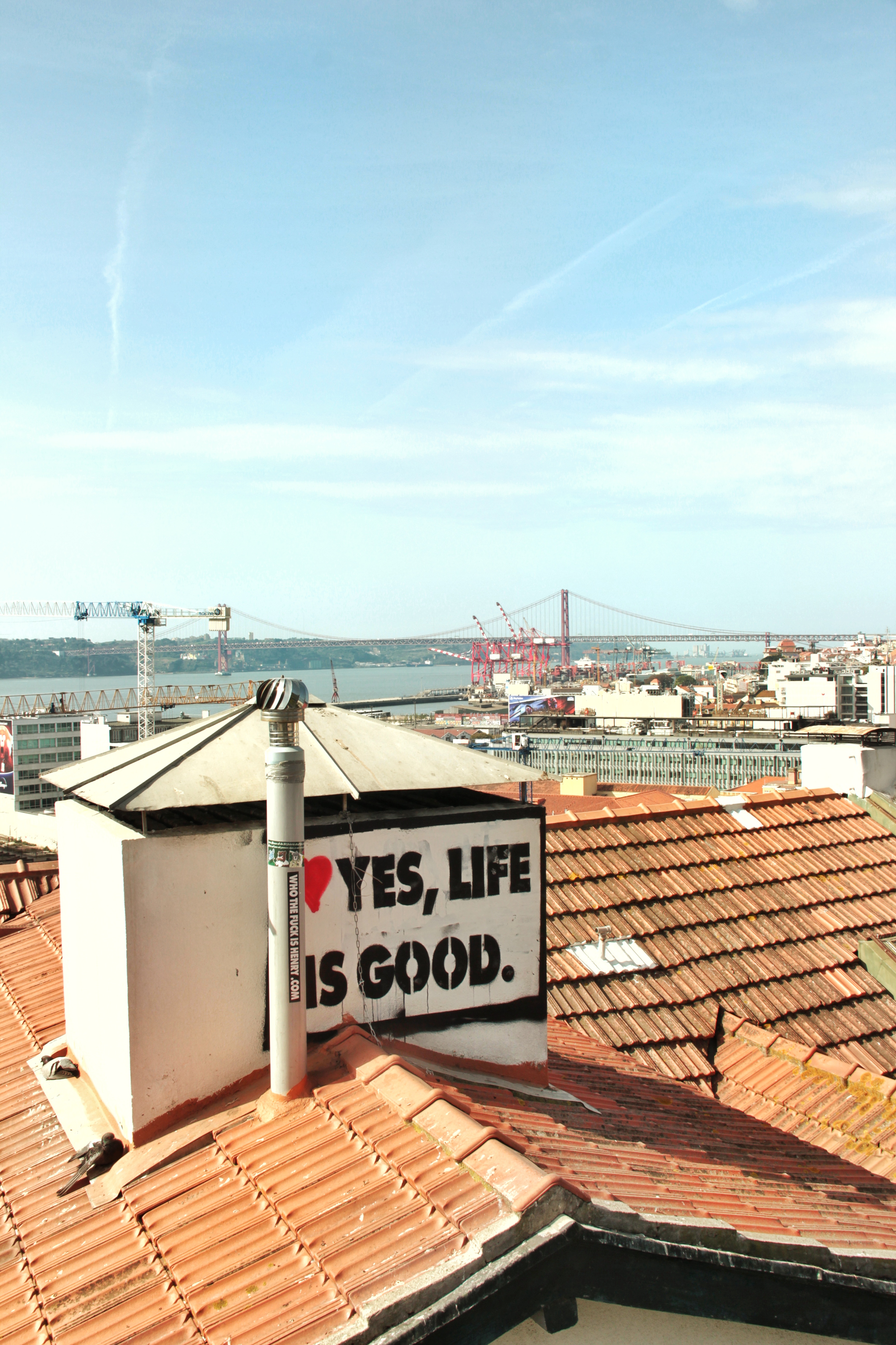 09:00 Uhr morgens, es ist noch ruhig in den Gassen von Bairro Alto. Über mehrere Treppen an blühenden Bäumen vorbei lande ich an einer steilen Strasse mit einer graffitibesprayten Tram. Ein Obdachloser hält ein Schwätzchen mit dem Friseur und anschliessend wäscht er sich das Gesicht am Brunnen. «Bom Dia!», ruft er mir freundlich zu. «Bom Dia!», spreche ich ebenfalls mit kräftiger Stimme aus und lächle. Wieder steige ich viele Treppen hinauf, doch in Lissabon fühlt sich das nicht so schwer an, immer wieder halte ich inne, um die Wohnhäuser mit ihren Wäscheleinen und kleinen Balkonen zu begutachten. Mein erstes Ziel, die Aussicht Miradouro Santa Catarina, habe ich erreicht. Sie bietet einen Weitblick auf den Hafen und der Spruch auf dem Hauskamin sagt das aus, was ich gerade denke: «Yes, life is good».