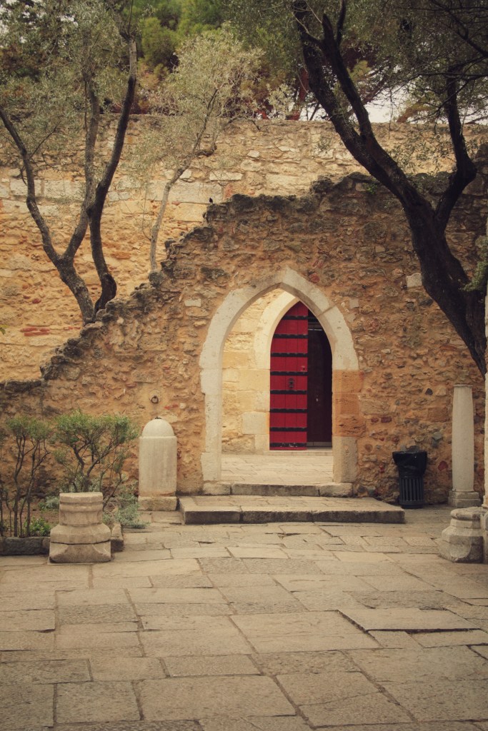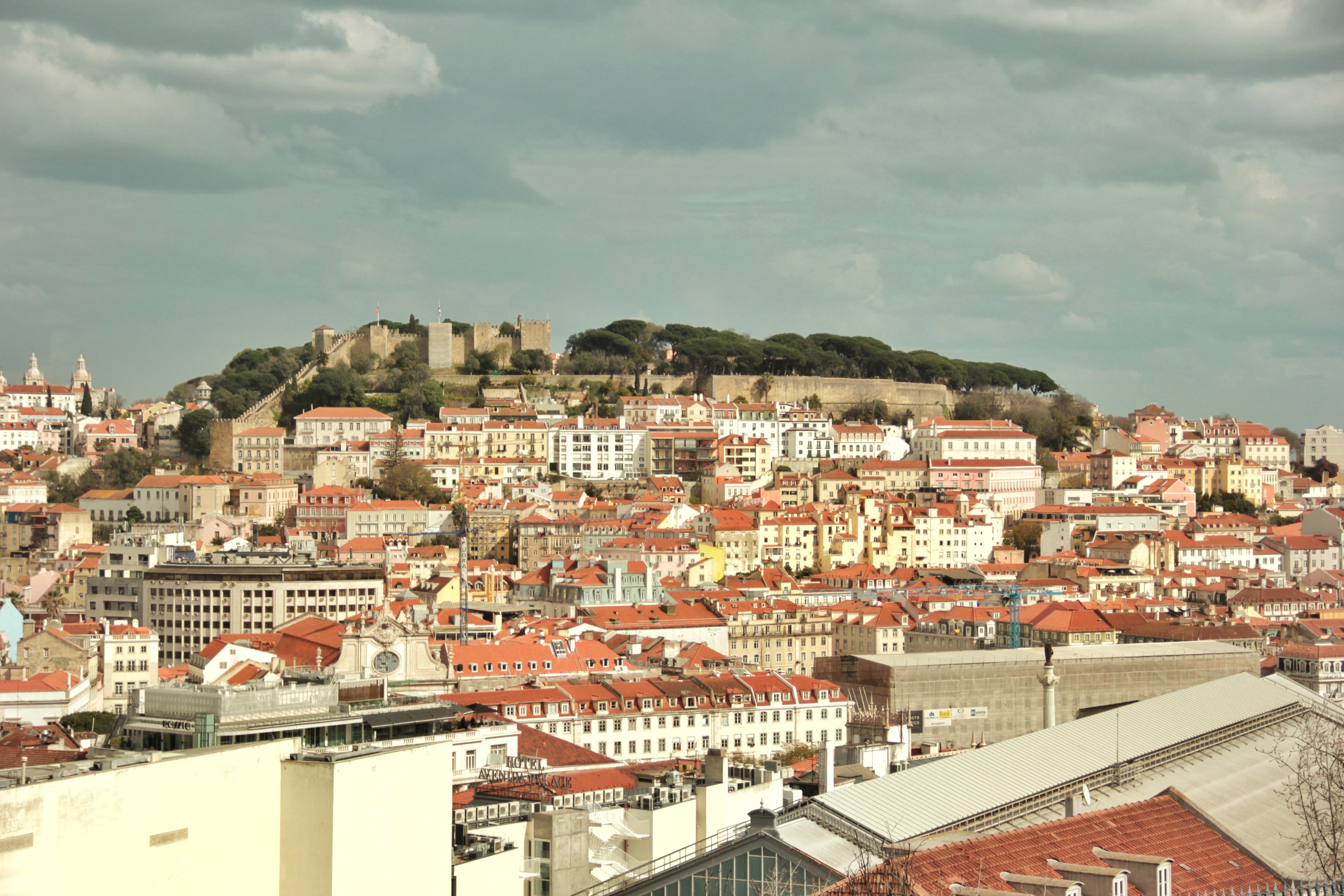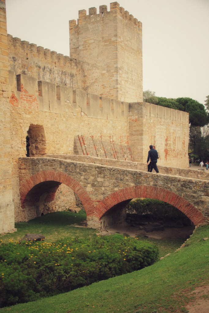 So gut ich den ganzen Tag hier verbringen könnte, möchte ich ihn noch anders auskosten und so viel wie möglich von Alfama sehen. Google Maps führt mich noch weiter nach oben, auf einen Hügel, wo die Sehenswürdigkeit Castelo de São Jorge herausragt. An den Seitenstrassen sitzen Künstler, die mit Wasserfarben und Kohle Bilder aus Lissabon mahlen. Ein Musiker versüsst mit seiner Klangtrommel den Menschen in der Warteschlange die Zeit. Der Eintritt zur Festung kostet 10 Euro. Wenn du vor hast, vor deiner Reise eine Lisboa Card zu kaufen, musst du wissen, diese ist für den Besuch ins Schloss nicht gültig. Dennoch, durch die grosse Festungsanlage mit beeindruckenden Ruinen, die vielen wunderschönen Pfaue, die dort herumstolzieren und durch den besten Ausblick auf Lissabon lohnt sich der Eintritt.