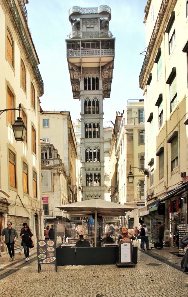 Etwa 30 Minuten später geht die Strasse wieder bergab. Ich bin mir bewusst, meine Schritte lohnen sich, da ich bald in einem feinen Restaurant mein Mittagessen geniessen kann. Die Strassen füllen sich, der schönste und wärmste Tag der Woche – habe übrigens eine verbrannte Stirn – lockt viele Touristen und Einheimische aus den Häusern. Wie Ameisen suchen sie ihren Weg. Gekonnt weichen sie einander aus, um nicht auf andere Ellbogen zu stossen. Eine lange Schlange zeigt sich vor dem Elevador de Santa Justa, ein Lift, der die Unterstadt Baixa mit der oberen Bairro Alto verbindet. Mir genügt es, den Menschen zuzuschauen und den Bau inmitten schmaler Gassen gebaut, von unten zu bewundern.